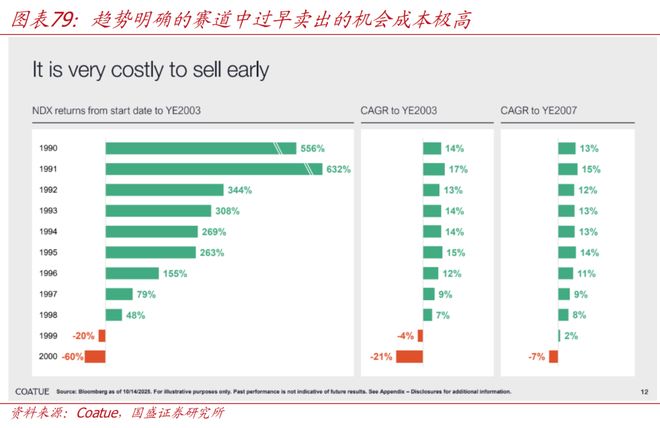 AI革命是否存在泡沫?伴随着中美科技股市值的不断扩大,有关“AI泡沫”的探讨也在不断提升,主要逻辑是对潜在需求、资本开支的合理性等方面产生质疑,特别是2025年初DeepSeek横空出世,一度也“戳破”了唯算力论的AI叙事。我们认为,从以下四个方面来看,“AI泡沫”还远未到泡沫阶段:一是杰文斯悖论,即技术效率提升可能并未减少算力资源的需求,反而通过推动了更广泛的应用场景带来了更强烈的算力消耗需求。人工智能行业也即如此,模型、算力等领域的效率提升似乎会导致所需token、芯片等数量下降,事实上却反而推动了人工智能的加速发展,从而带动更多token和芯片的消耗,这种自我强化与其他产业不同。二是当前估值尚未走到极端。从美股视角来看,相比于“互联网泡沫”,当前绝对估值水平和相对估值水平均仍有一定距离,尚未走到极端。三是“泡沫”背后是最“坚实”的现金流支撑。由于美股大型科技股的快速上涨产生了“泡沫”的担忧,但也需要清晰的看到,当前这些大幅上涨的科技股背后拥有最坚实的现金流支撑,特别是部分公司的运营现金流远高出资本开支规模。四是当前仅处于人工智能科技革命的初期,部分“增长预期”在当下看来确实需要一定的“想象力”,但更重要的是“趋势明确的赛道中过早卖出的机会成本极高”,20世纪90年代“信息高速公路”带动的互联网浪潮推动纳斯达克指数持续上涨,在2000年“互联网泡沫”前,纳斯达克指数已经连续9年(1990至1998)大幅上涨。