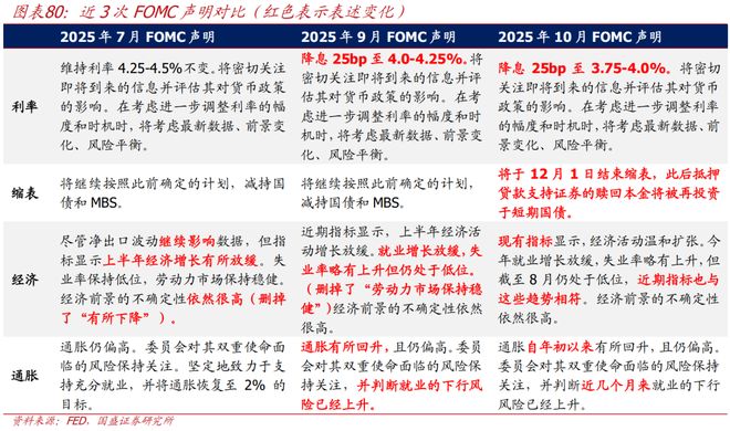 10月30日,美联储下调联邦基金利率25bp至3.75-4.0%,符合市场预期,并宣布将于12月1日结束缩表,此后抵押贷款支持证券的赎回本金将被再投资于短期国债。值得关注的是,本次会议有2人投下反对票,其中,米兰主张降息50bp,施密德主张不降息。鲍威尔讲话表示,停摆前的数据显示,经济可能正朝着更稳固的轨道发展。本次降息和9月一样是基于风险管理的逻辑,官员们对后续如何推进政策存在严重分歧,12月再次降息远未板上钉钉。目前利率已处在很多中性利率预估的范围内,在缺乏数据的情况下,越来越多的官员希望推迟降息,认为应至少等待一个周期。货币市场压力要求立即调整资产负债表操作,12月将进入资产负债表的下个阶段,短期内将保持稳定。