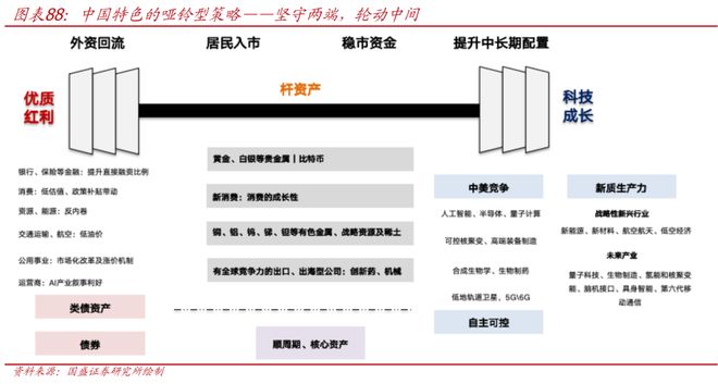 具体看,我们提出中国特色的哑铃型策略,将是较好的配置方式,两端是配置重点方向,中间杆资产适当做轮动: