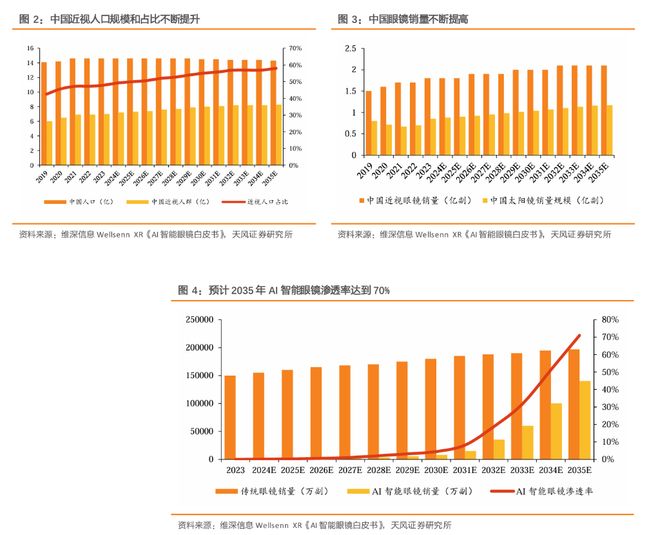 天风证券的报告指出,AI眼镜市场增长的核心逻辑在于对庞大存量市场的替代。以中国为例,近视人群比例接近50%,潜在佩戴者约7亿人,近视眼镜年销量约1.5亿副且仍在稳步增长。同时,太阳镜年销量也稳定在亿级水平。然而,目前AI在眼镜品类的渗透率仍处于极低水平,这为智能化升级提供了巨大的想象空间。