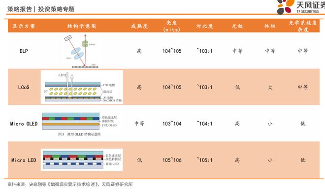 与光学模组相匹配的微显示器,同样存在两条技术演进路径。研报分析称,目前以Micro OLED(硅基OLED)为主流,其高对比度的优势使其成为当前多数产品的首选。不过,Micro OLED在亮度上的不足和相对较短的使用寿命,限制了其在户外强光环境下的应用表现。