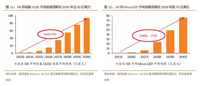被寄予厚望的Micro LED技术,则被视为更理想的AR解决方案。它具备高亮度、长寿命的核心优势,能更好地满足全天候使用场景。尽管前景广阔,但Micro LED目前受制于制造工艺不成熟和良率较低等问题,距离大规模量产尚需时日。天风证券援引维深信息Wellsenn XR的预测数据,AI眼镜等XR新品的密集发布将持续拉动微显示器需求,预计到2030年,XR用Micro OLED和Micro LED的市场规模将分别攀升至94亿美元和76亿美元,呈现出双技术路线并行的强劲增长轨道。