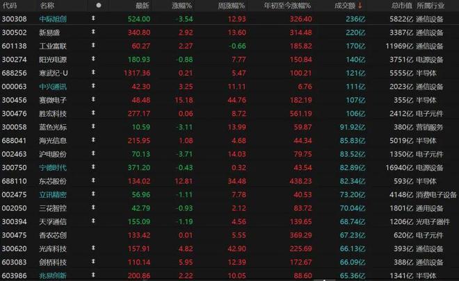 个股分化,2790只个股收涨,涨停股63只;2447只个股收跌,跌停股14只。今日有8只个股日成交额超过100亿元,中际旭创收跌3.54%报524元/股,新易盛涨近3%,赛微电子涨逾15%,东芯股份涨近13%。阳光电源、宁德时代均微跌。