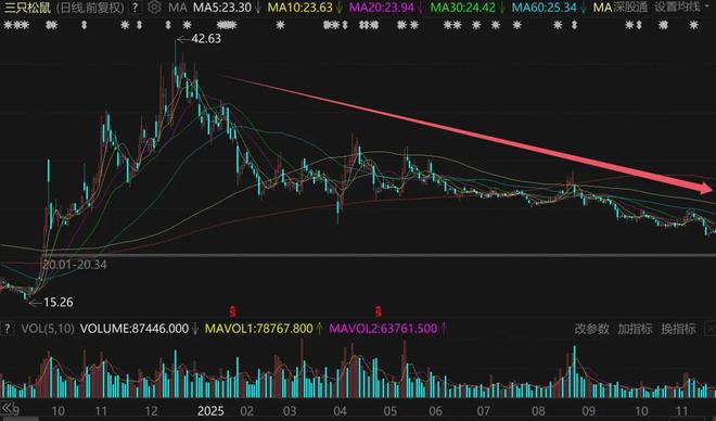 2025年以来,三只松鼠股价已经暴跌38.5%,这近40%的巨大跌幅,跟同期上证指数上涨15.6%、深圳成指上涨23.6%、创业板指数大涨41.5%的局面形成鲜明对比。