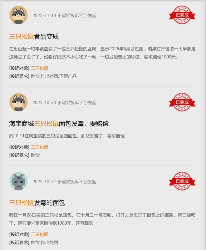 在黑猫投诉平台,三只松鼠的投诉词条近5000条,不少消费者都反映食品有异物、发霉等问题。