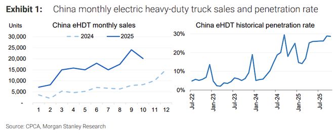 大摩表示,卡车电动化,尤其是重卡领域,正展现出远超乘用车的增长爆发力。2025年10月,中国电动重卡销量同比飙升144%,渗透率已高达29%。