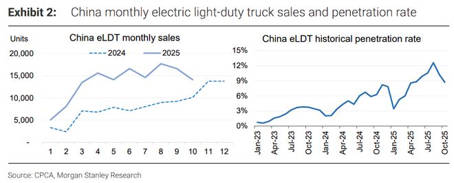 如果说重卡是“先锋”,那么轻卡就是即将爆发的“主力军”。大摩表示,2025年10月,电动轻卡销量同比增长40%,而年初至今的累计销量同比增长则高达92%。