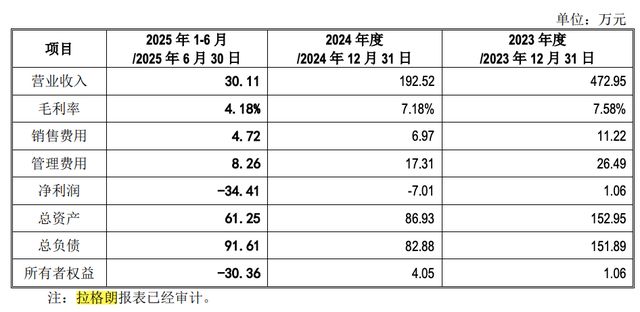 但《回复函》显示,2023年、2024年、2025年1-6月,拉格朗营业收入分别为472.95万元、192.52万元和30.11万元,毛利率分别为7.58%、7.18%和 4.18%,净利润分别为1.06万元、-7.01万元、-34.41万元。即使以总资产来看,截至2025年6月30日,拉格朗为61.25万元。
