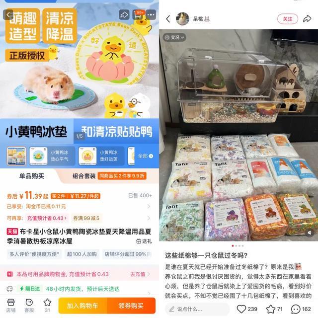 【左:小黄鸭联动仓鼠用品;右:热衷于购买彩色纸棉的消费者】