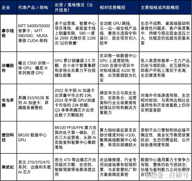 为了让格局更直观,可以把几家典型国产算力厂商放在一张表里横向看(仅基于公开信息,出货为区间或定性描述):