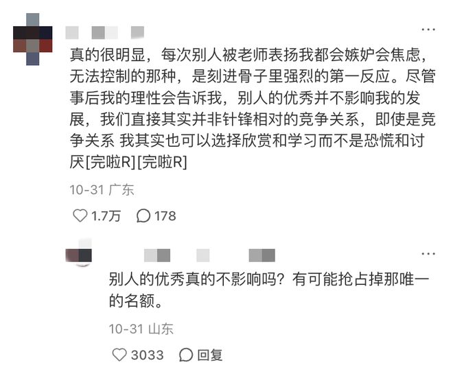 有人无法忍受别人受到夸奖,甚至别人被老师表扬都会产生无法控制的嫉妒和焦虑。尽管理智一直告诉自己,别人的优秀不等于自己的失败。即便不是针锋相对的竞争关系,只要底层代码一发力,就控制不住开始恐慌和妒忌。