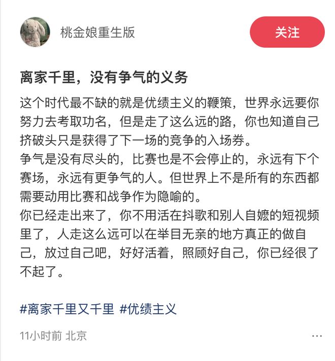 如果放在十年前,年轻人或许会为了这句话热血沸腾或热泪盈眶。但在当下,年轻人不约而同地质疑这句话:离家千里,没有争气的义务。