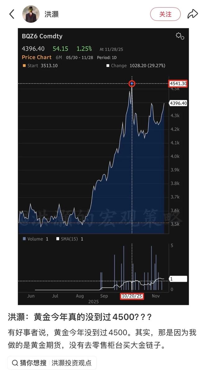 近期黄金市场经历了前所未有的狂热与剧烈波动,一则关于知名经济学家洪灏“精准逃顶”的消息在投资圈炸开了锅。11月28日,其公开宣称已在4500美元/盎司的高位清仓黄金,并预警“泡沫必然破裂”。