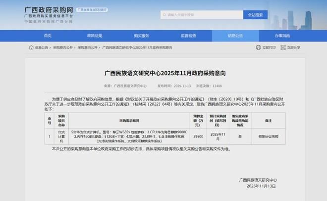 据广西民族语文研究中心11月13日在广西政府采购网发布的公告,该中心计划于2025年11月采购5台华为台式计算机,型号为擎云W585x。其性能参数如下:1. CPU:华为海思麒麟9000C;2. 内存:16GB;3. 硬盘:512GB+1TB;4. 显示器:23.8英寸;5. 含正版操作系统(支持统信操作系统、支持银河麒麟操作系统)。公告显示,本次采购预算金额为29500万元,预计采购时间为2025年11月,并备注为“框架协议采购”。