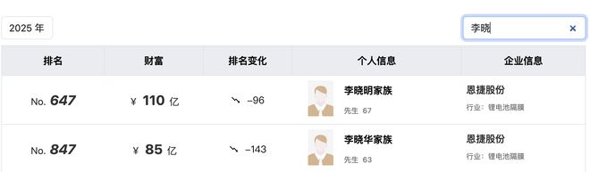 据胡润研究院最新公布的2025年《胡润百富榜》显示,今年一共有4位云南企业家上榜,其中李晓明以110亿财富位列云南第一,而恩捷股份另外一位股东李晓华也凭借85亿财富位列其中。