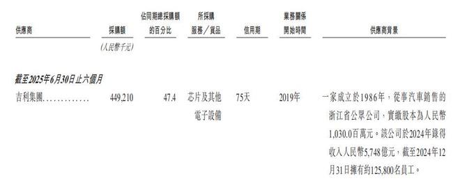 值得关注的是,瑞泰克去年和今年上半年这家占总采购额39.5%和47.4%的供应商也是吉利,福瑞泰克向其采购芯片及其他电子设备,且给予吉利 75 天信用期,高于其他主要供应商最高 60 天的信用期。