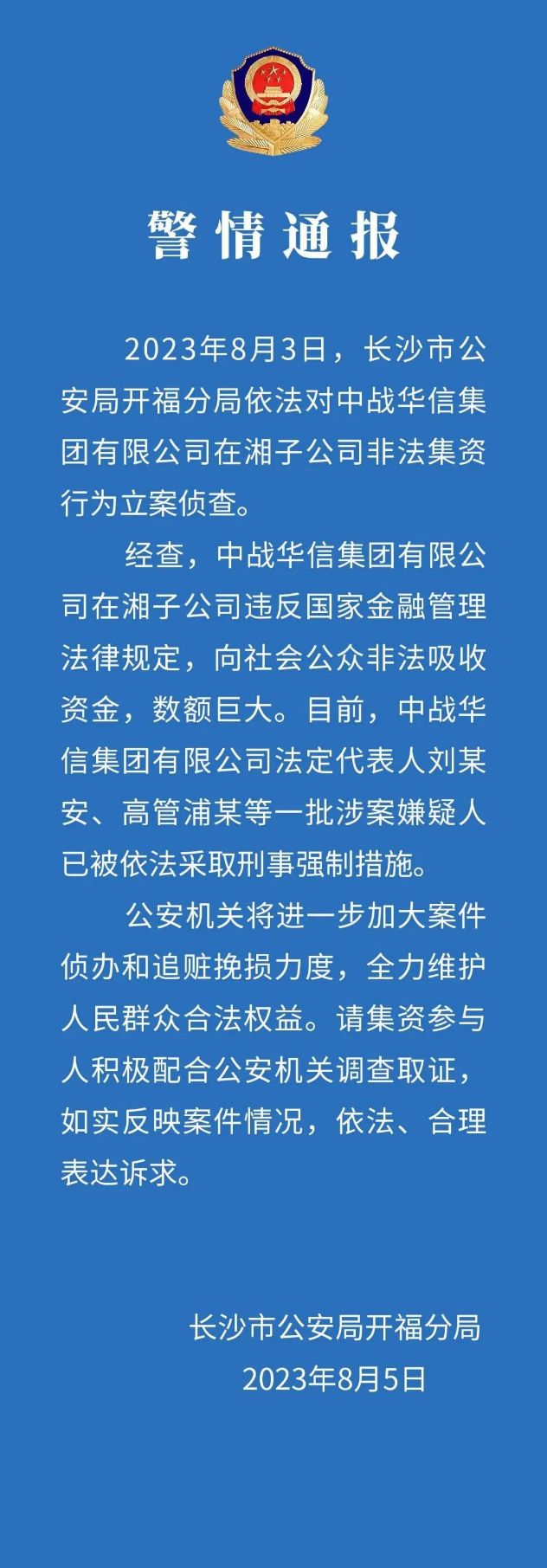 ▲公安部门对中战华信集团的通报/ 来源:长沙市公安局