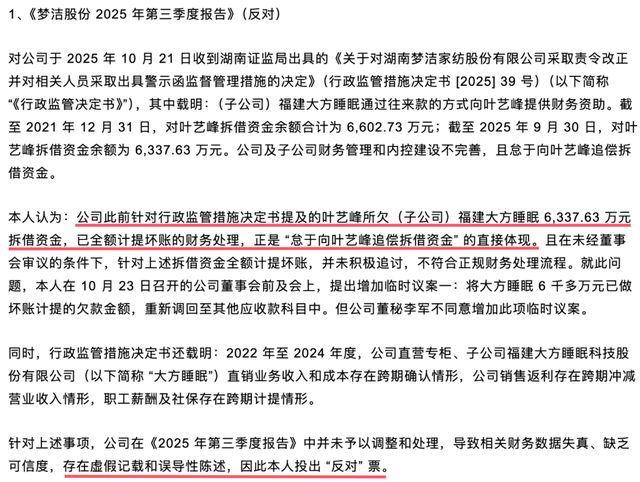 其中最让人关注的是一笔6337.63万元的拆借资金。2025年三季报发布时,陈洁直接提出反对意见,指责公司的财务数据不真实,这也是她近期举报信的核心内容之一。具体来说,梦洁的子公司福建大方睡眠通过往来款的方式,给叶艺峰提供了这笔大额资助。到2021年底,欠款达6602.73万元,而到2025年9月30日,余额降到了6337.63万元。湖南证监局在2025年10月发布的监管措施中指出,梦洁未按规定及时追收这笔钱。