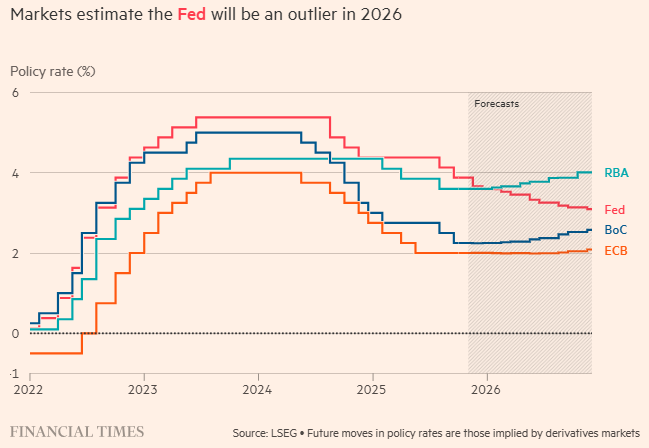 而英国央行则预计将在明年夏季前结束降息周期。经合组织上周表示,预计英国央行降息将“在2026年上半年停止”,因为该组织认为英国是少数几个利率已接近所谓中性利率——即既不抑制也不刺激经济增长的理论水平的大型经济体之一。