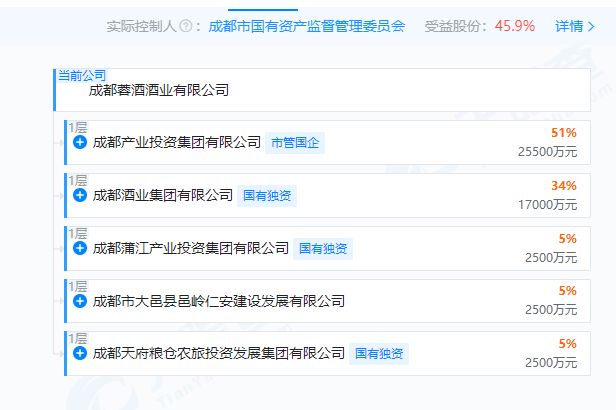 天眼查显示,该公司背后股东阵容豪华,由成都产业投资集团有限公司、成都酒业集团有限公司、成都天府粮仓农旅投资发展集团有限公司、成都蒲江产业投资集团有限公司、成都市大邑县邑岭仁安建设发展有限公司共同持股,持股比例分别为51%、34%、5%、5%、5%,以上企业均为国资控股企业。