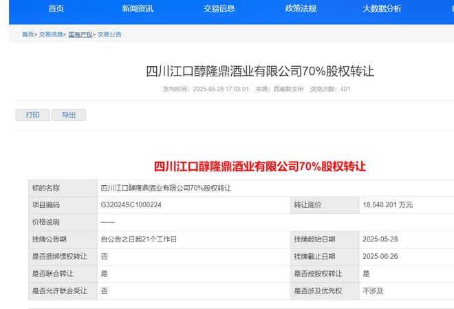 微成都注意到,今年5月,江口醇隆鼎酒业70%股权曾在西南联交所挂牌转让,底价约1.85亿元,具体包括振兴一号基金持有的全部股权,以及巴中市国有资本运营集团所持28.7206%股权。不过,从当前工商信息上来看,该交易并未完成。