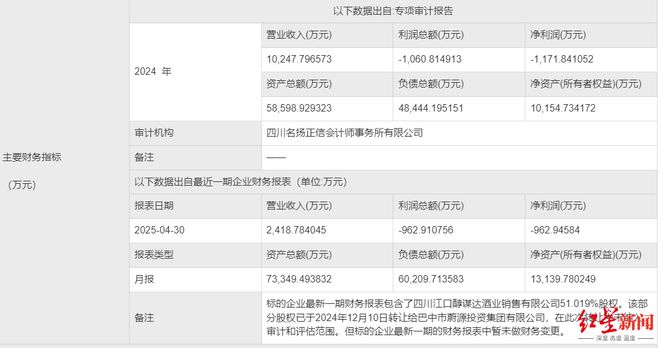 从转让公告披露信息可以看出,江口醇隆鼎酒业目前经营情况并不理想。财务数据显示,公司2024年营收1.02亿元,净亏损1171.84万元,资产负债率约为82.67%;2025年前四个月,实现营收2418.78万元,净利润为亏损962.95万元。