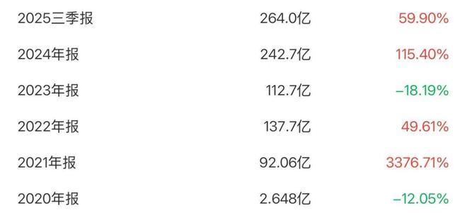 数据显示,2021年至2025年前三季度,公司分别实现营收92.06亿元、137.70亿元、112.70亿元、242.70亿元、264.00亿元,分别增长3376.71%、49.61%、-18.19%、115.40%、59.90%,整体规模从原来的不到3亿元,跃升至超过260亿元,可谓惊人。