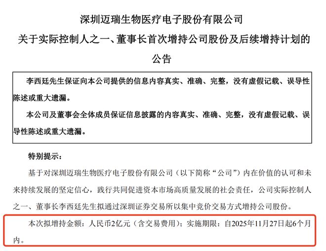 增持公告中迈瑞医疗还表示,在未来的6个月内,公司董事长李西廷将继续增持公司股份,增持金额2亿元(含本次增持金额)。