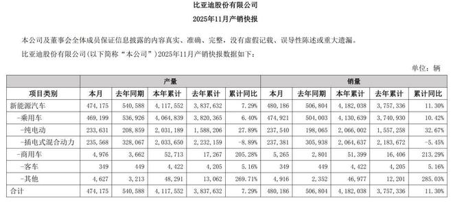 据比亚迪公布的数据显示,2025年11月比亚迪新能源汽车销量为48.0万辆,同比下滑5.3%,其中新能源乘用车销量为47.5万辆,同比下滑5.8%。截至11月底,比亚迪新能源汽车累计销量418.2万辆,同比增长11.3%,其中新能源乘用车销量为413.1万辆,同比增长10.4%。不过,据统计,如果剔除海外销量,比亚迪单月销量已经连续7个月同比下滑,前11月销量则同比下滑4.8%。