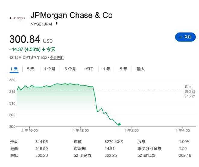 摩根大通股价周二盘中跌幅一度超过4.7%,创下自10月中旬以来的最大单日盘中跌幅,也因此成为KBW银行指数中表现最差的成分股。