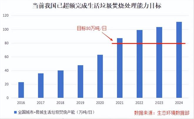 根据“十四五”规划,到2025年全国城镇生活垃圾处理能力目标为每日80万吨左右。但实际上,我国提前几年就已超额达成。