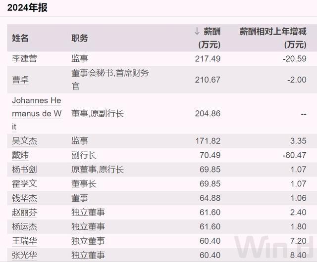 根据公司年报,2024年曹卓税前薪酬为211万元,高居第二,是该行三位薪酬超过200万元的高管之一,远远超过董事长霍学文和行长杨书剑薪酬,都不到70万元。