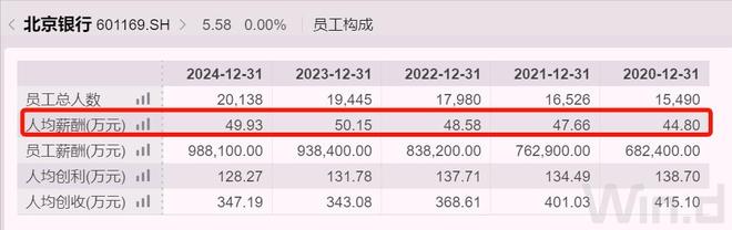 至2024年末,北京银行职工总数超过2万人,去年人均创利128万元,人均税前薪酬大约50万元,和2023年基本持平;但比同城的华夏银行人均薪酬高近9万元。