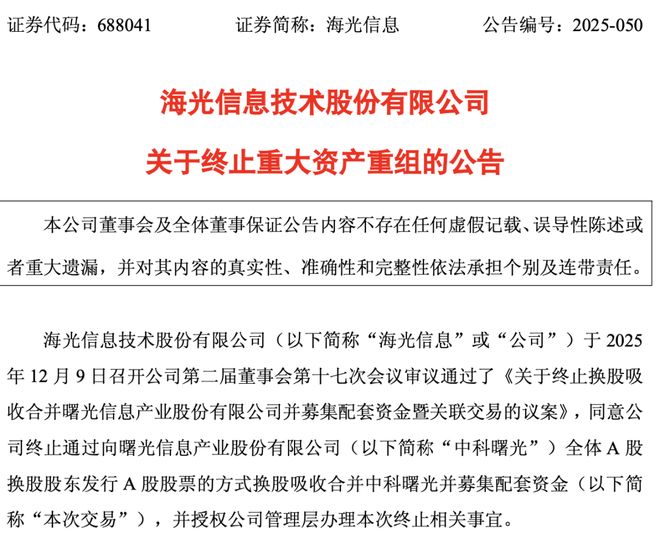 此外,海光信息承诺自终止披露之日起至少1个月内不再筹划重大资产重组事项,并拟于2025年12月10日召开投资者说明会,就终止事项与投资者交流。