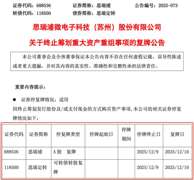 同日,A股知名芯片公司——思瑞浦也发布公告称,公司决定终止筹划购买宁波奥拉半导体股份有限公司(以下简称“奥拉股份”)股权并募集配套资金的重大资产重组事项,公司股票及可转债将于明日(12月10日)开市起复牌。