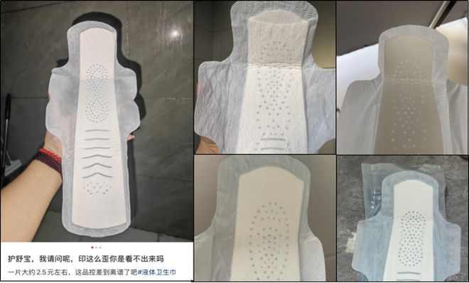 近日,有消费者向《消费者报道》报料称,自己在护舒宝官方渠道购买的液体卫生巾存在做工问题,导致使用效果差强人意。同时,记者在社交平台发现,的确有不少网友晒图吐槽护舒宝液体卫生巾,“印这么歪你是看不出来吗”,相关图片中,本应居中平整的吸收芯体歪向一侧。有网友认为,正是因为芯体歪斜,导致自己经血侧漏,非常狼狈。