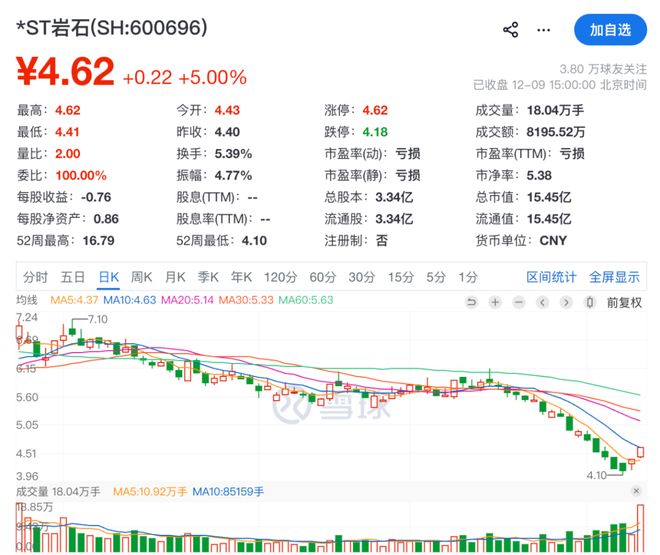 值得注意的是,该传闻或推动公司股价连续两日异动,12月9日,*ST岩石高开高走,盘中触及涨停,截至收盘报4.62元/股,涨5%,市值为15.45亿元。此前的12月8日,公司股价已涨停。*ST岩石今年整体股价一路下行,相较于年内14.84元的高点已跌超60%。