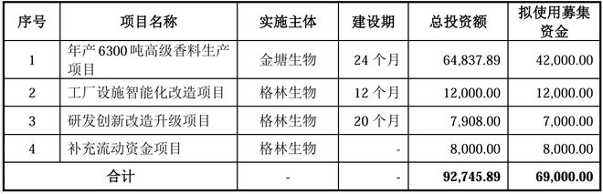 2025年11月21日,格林生物第三次向深交所创业板提交招股说明书,拟募集资金约6.9亿元。募集资金将按照轻重缓急顺序投资年产6300吨高级香料生产项目、工厂设施智能化改造项目、研发创新改造升级项目以及补充流动资金项目。