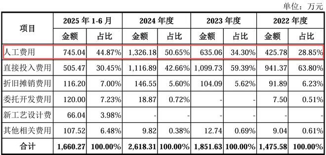 其研发投入的结构也颇为耐人寻味。2022年、2023年,格林生物研发投入中的人工费用占比均在30%左右,到了2024年人工费用同比暴涨109%至1326万元,占比过半,而直接投入费用仅增长1.56%。2025年上半年,其人工费用就已经超过了2023年人工费用的总和。