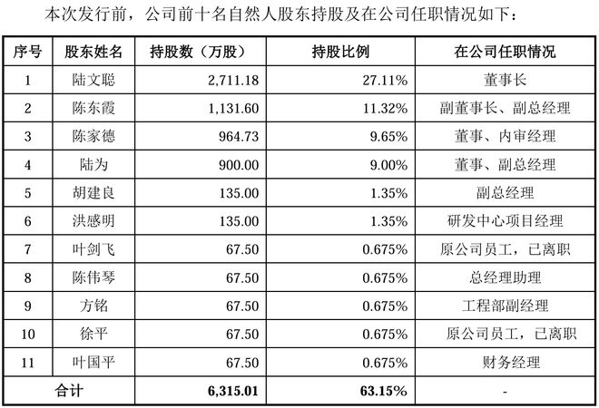 截至申报前,陆文聪父女合计掌控36.11%股权,加上副董事长陈东霞、董事陈家德等早期核心成员的持股,管理层合计持股超57%,前十大自然人股东均为公司高管或员工。