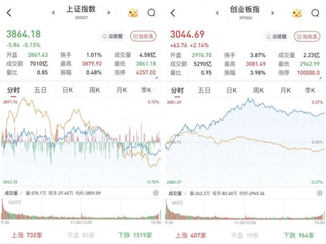 至收盘,上证综指跌0.15%,报3864.18点;科创50指数涨0.99%,报1315.04点;深证成指涨1.02%,报12907.83点;创业板指涨2.14%,报3044.69点。