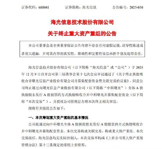 新浪科技讯 12月9日晚间消息,中科曙光与海光信息同时发布公告,宣布终止重大资产重组,并表示本次交易终止不会对公司的生产经营和财务状况造成重大不利影响,不存在损害公司及...